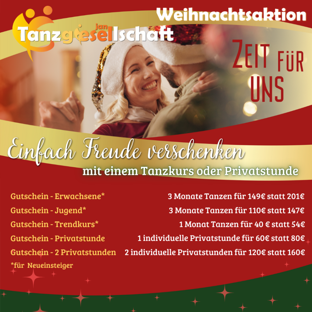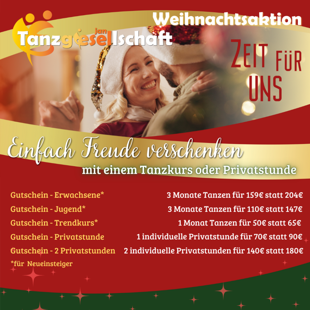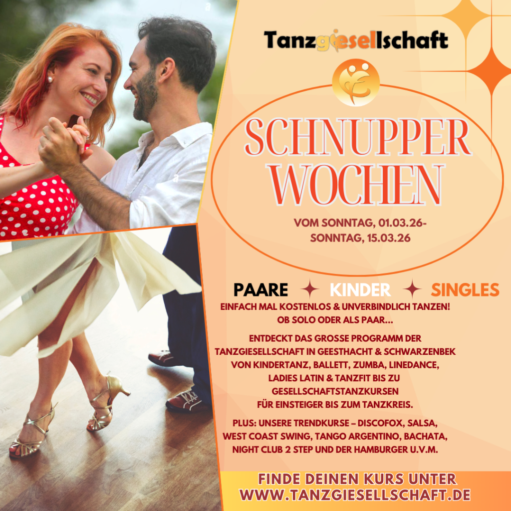 Ihr könnt in alle Bereiche einsteigen, reinschnuppern und eine Probestunde besuchen – vom Level 1 bis zum Tanzkreis im Gesellschaftstanzbereich, Kindertanz, Linedance, Hip Hop, Starmoves, Zumba, Discofox, Salsa, West-Coast-Swing und in vielen weiteren Kursarten.